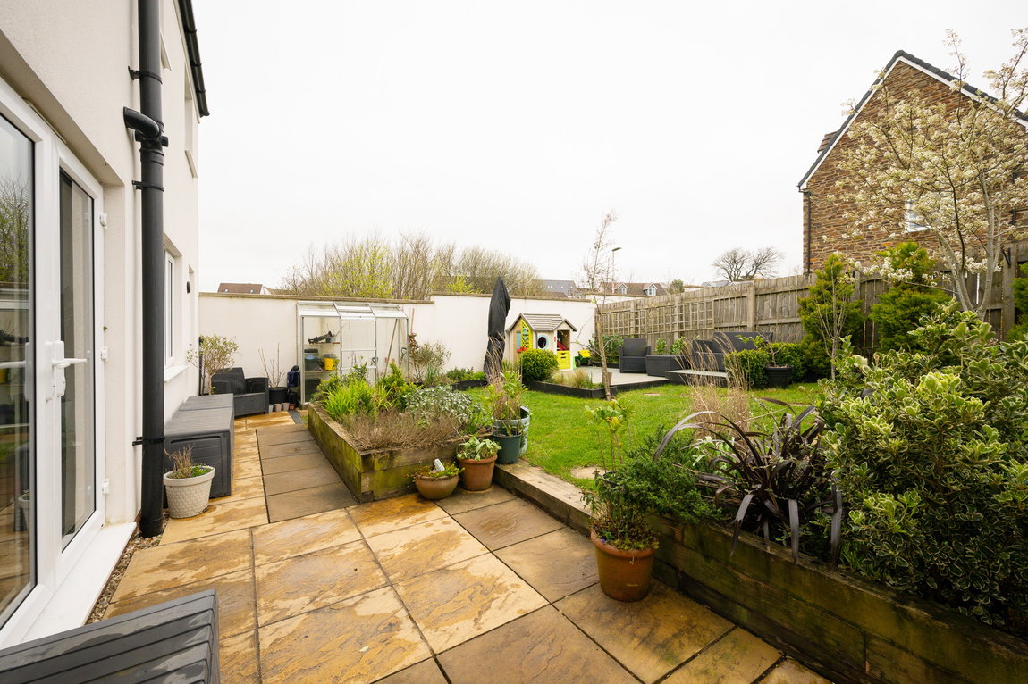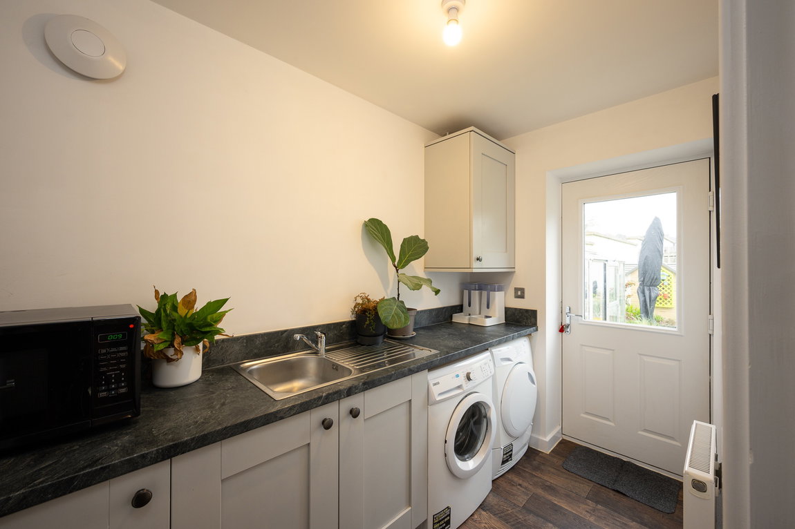 The garden itself is fully enclosed and thoughtfully arranged, featuring both a patio area for outdoor dining and a lawned section, ideal for families and those who enjoy outdoor space. A separate utility room offers additional practicality, with space for laundry and direct access to the garden.