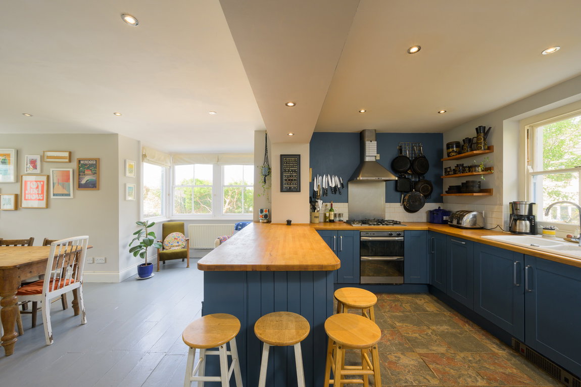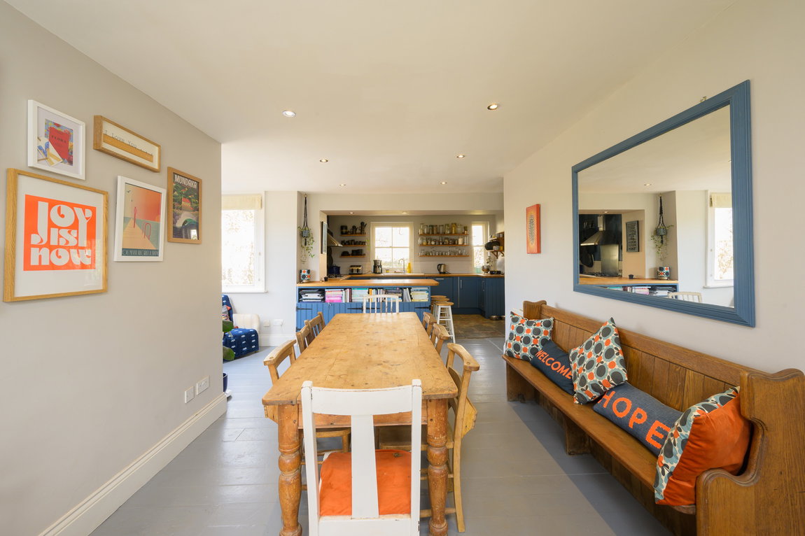 Open Plan Kitchen-Diner – The heart of the home, featuring an electric oven with gas hob, integrated dishwasher, and ample workspace for food preparation. A generous dining area provides space for a large table, while a pretty bay window creates the perfect nook for a sofa or cosy armchairs — a bright and inviting spot to relax or entertain.
