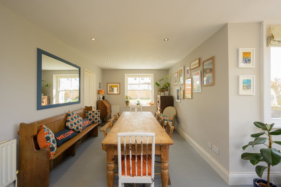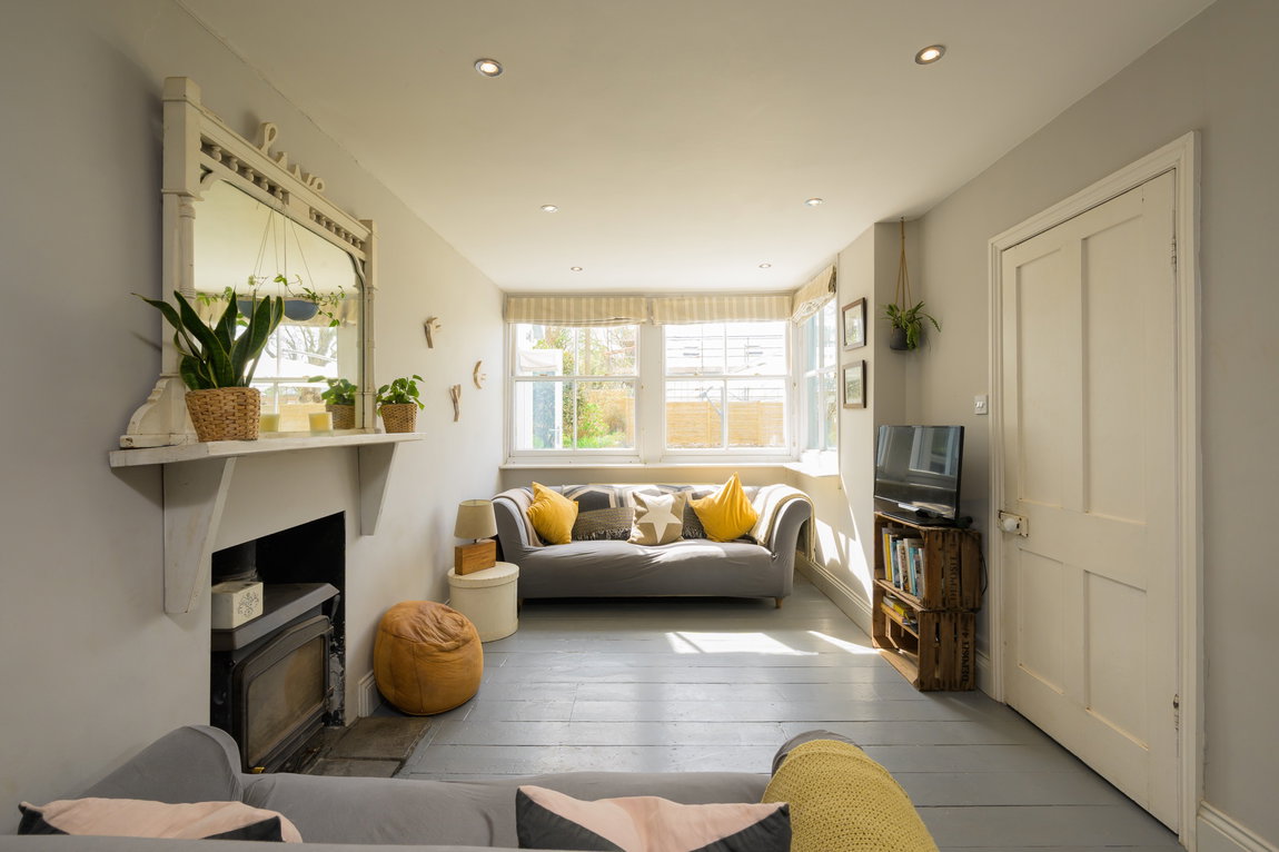 Living Room – Warm and welcoming, with an attractive log burner, original sash bay windows, and exposed floorboards throughout — adding to the home’s period charm.