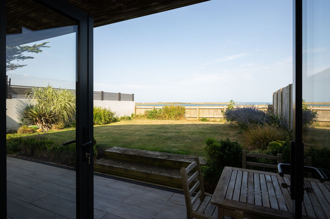 Inside, the open-plan living space is nothing short of stunning. With engineered hardwood flooring, vaulted ceilings, and floor-to-ceiling glazing, the room is bathed in natural light and frames the awe-inspiring estuary views. Step out onto the expansive glazed balcony, complete with contemporary stainless steel balustrade and soak in the peace, beauty, and ever-changing seascape.