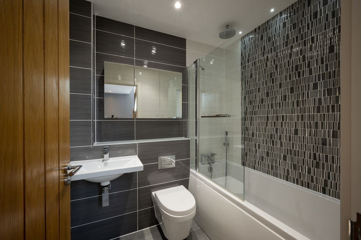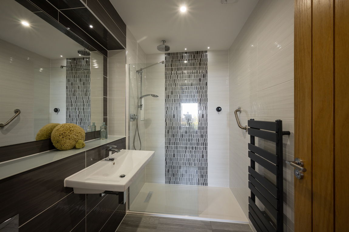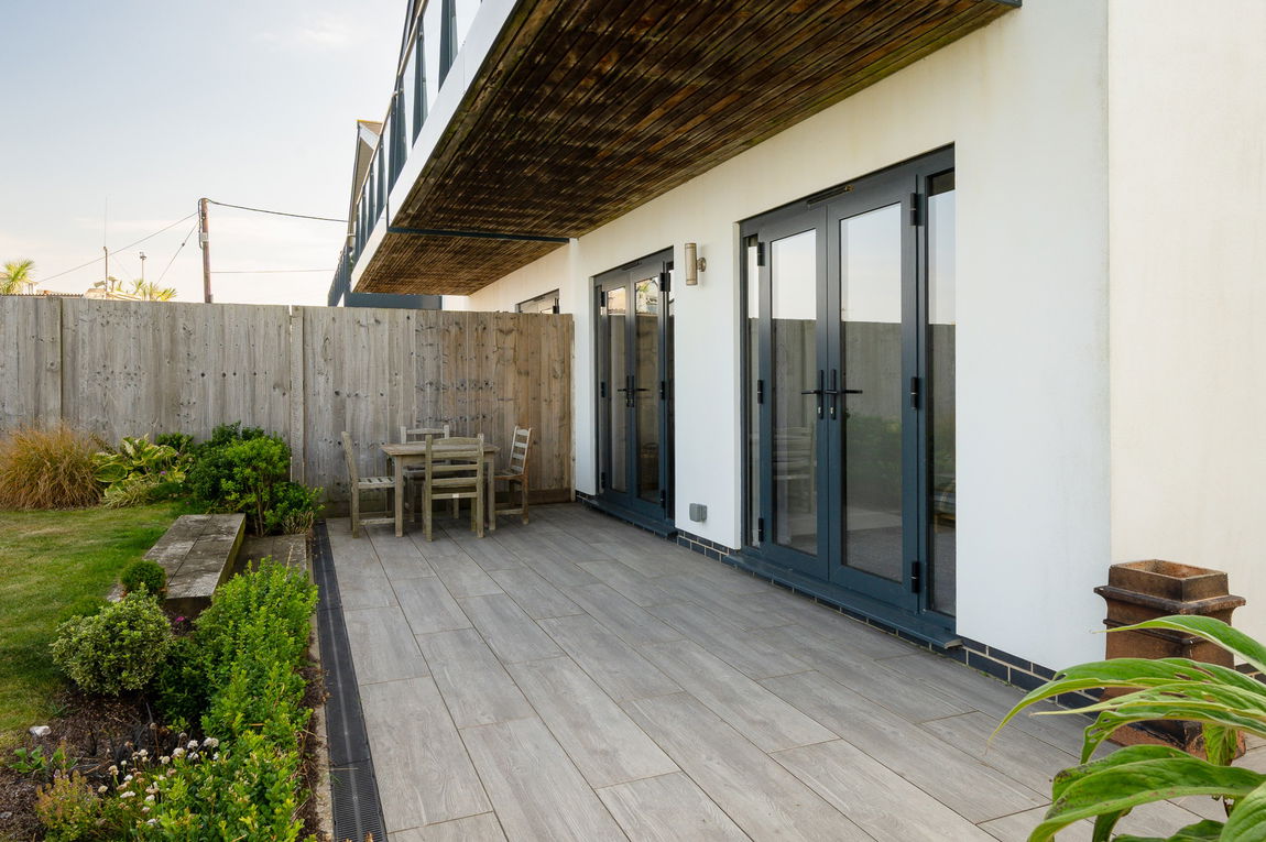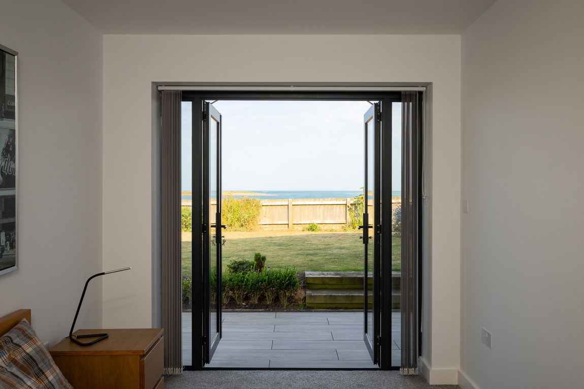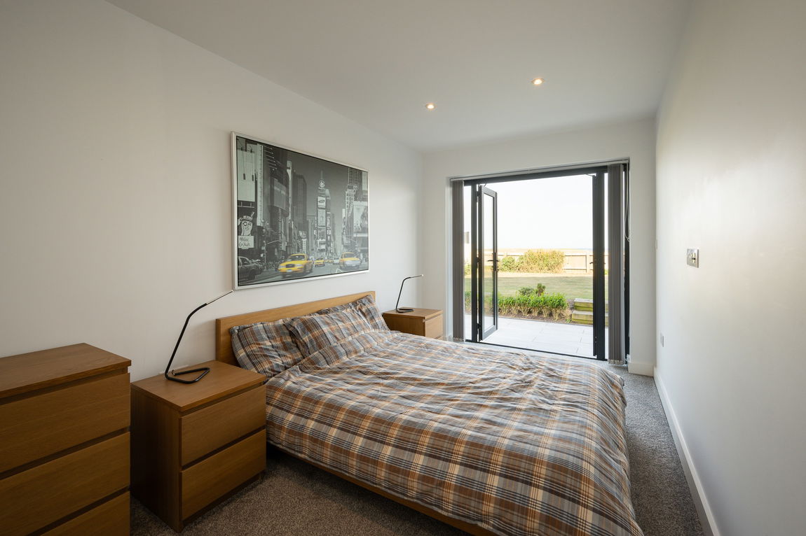 Downstairs, an oak and glass staircase leads to three generously sized bedrooms, including a luxurious master suite with a sleek ensuite shower room and digital rain shower. Bedrooms 1 and 2 open directly onto a sheltered patio, perfect for morning coffee or evening drinks with a view. A beautifully tiled family bathroom completes the lower level, echoing the ensuite’s stylish design.