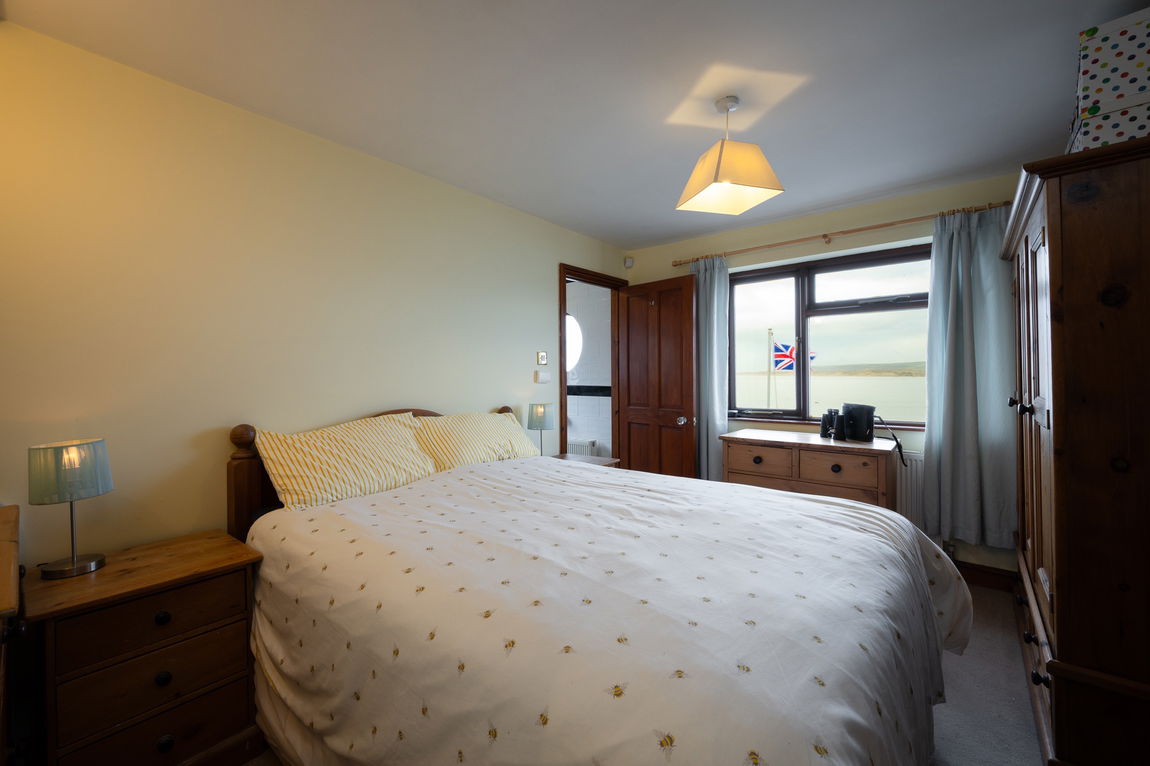 Step through the front door into a welcoming entrance porch, leading to a spacious living room adorned with a stone fireplace and under-stairs storage, offering tranquil views over the communal area and village memorial. The well-proportioned kitchen enjoys natural light and spectacular vistas across the estuary, making it the perfect spot for breakfast or entertaining. A ground-floor bathroom completes this level.