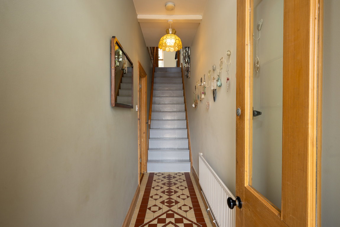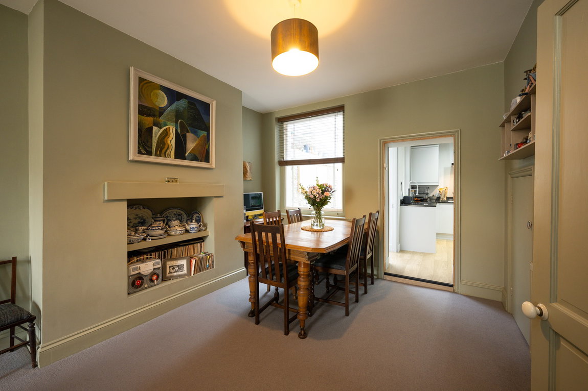 Upon entering, you are welcomed by a porch leading into the hallway, both featuring stunning tiled flooring that immediately sets the tone for the quality within. The home opens into a spacious open-plan living and dining area, enhanced by impressive 9ft high ceilings that create a wonderful sense of space and light. This inviting room also boasts attractive original wood flooring, a charming feature fireplace, and a large understairs cupboard providing excellent storage.