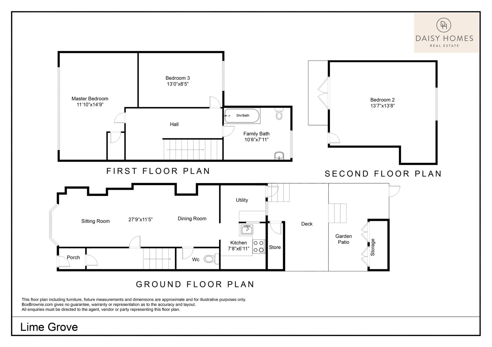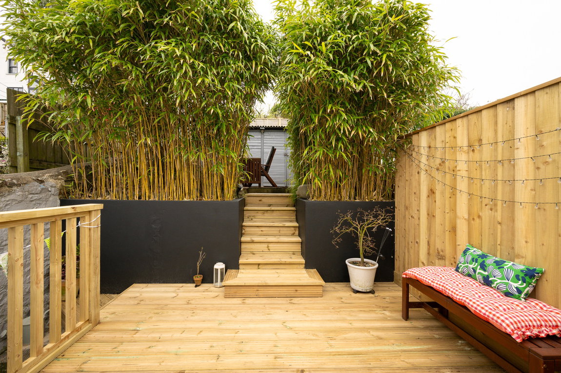 Upstairs includes a generous family bathroom, a principal bedroom with built-in storage, and a further private top-floor bedroom with ample eaves storage, ideal for guests or a teenager. The enclosed rear garden is arranged over tiers, with a sun-trap decking area, a bamboo-lined patio for added privacy, useful outbuilding storage, and rear pedestrian access.