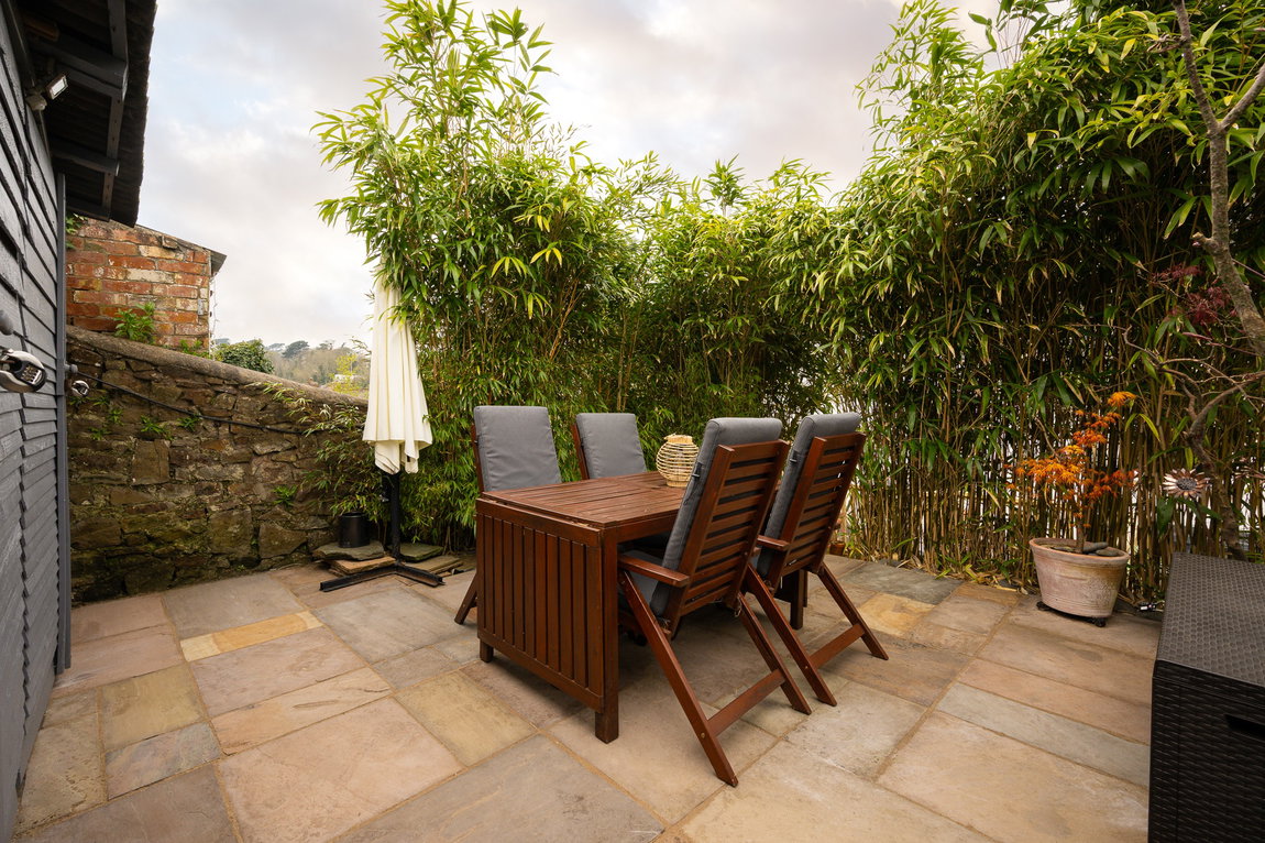 Externally, the enclosed rear garden is thoughtfully arranged across different levels. There is an outbuilding currently used for storage, while steps lead up to a newly fitted decking area, perfectly positioned as a sun trap for relaxing or entertaining. A further patio area, enclosed by bamboo, offers a wonderfully private space for evening enjoyment. The garden also benefits from additional storage to the rear and convenient pedestrian access.