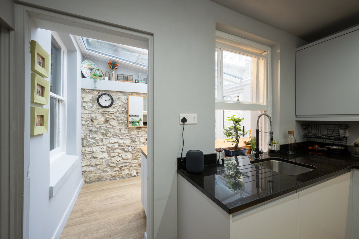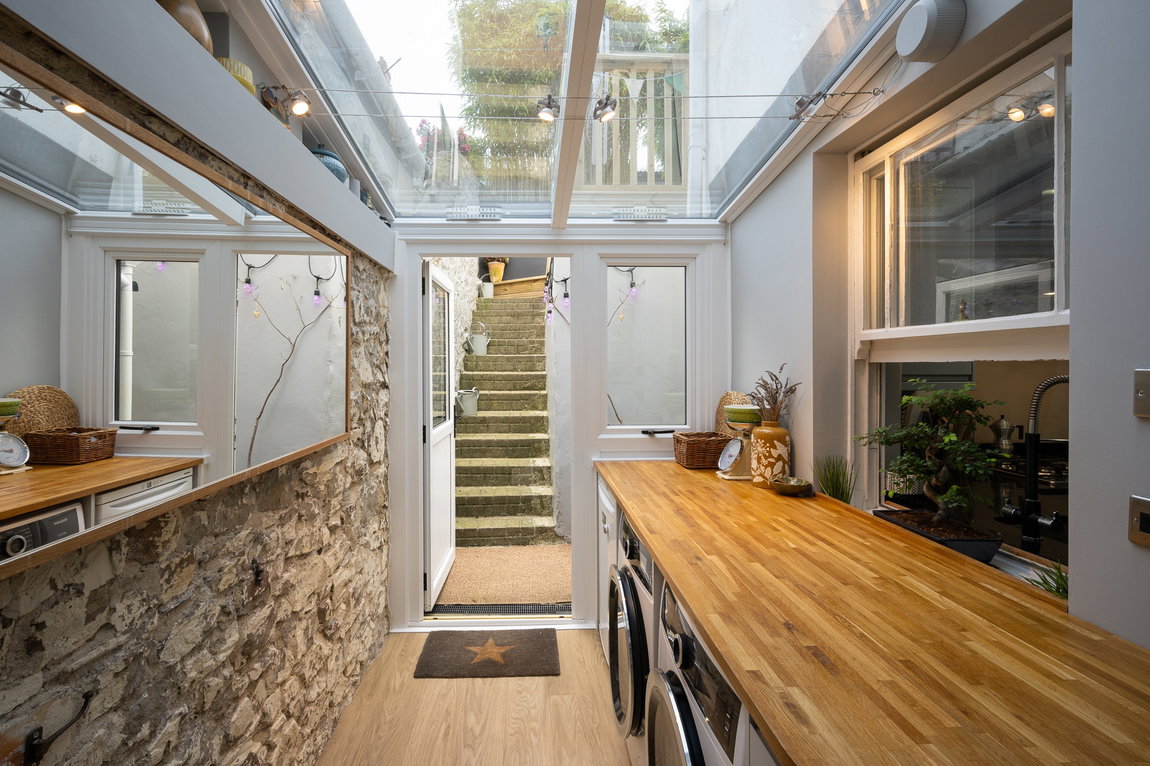 To the rear, a newly fitted modern kitchen is well-equipped with integrated appliances including a fridge, oven, hob, and dishwasher. This flows seamlessly into a bright and airy utility room with exposed brickwork. The room is complete with a privacy glass roof that allows natural light to flood the space while maintaining a sense of seclusion, an ideal area for laundry and additional storage.