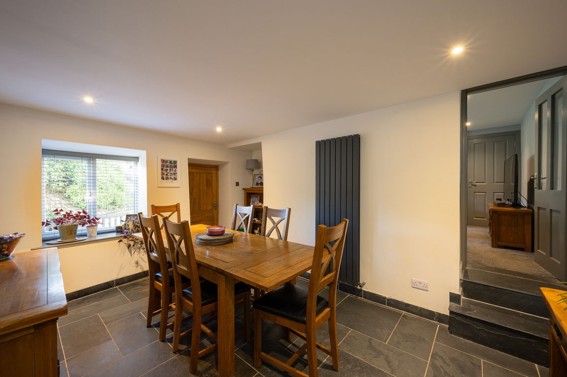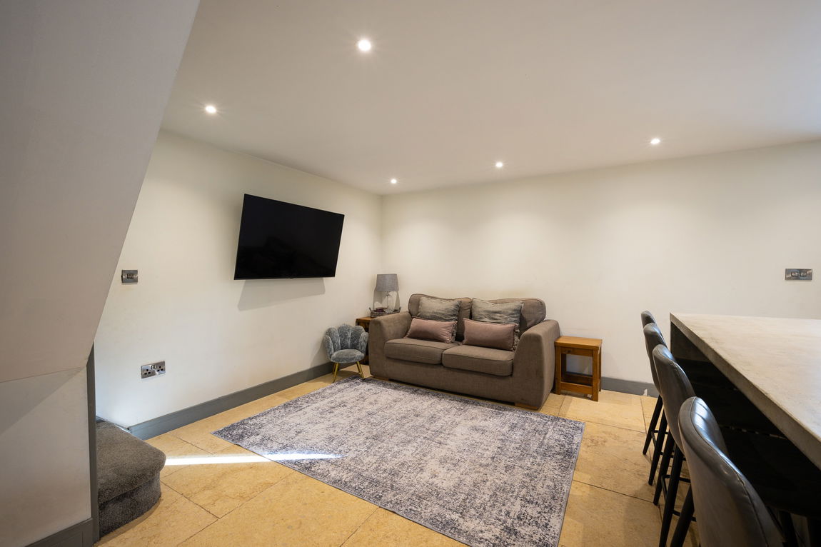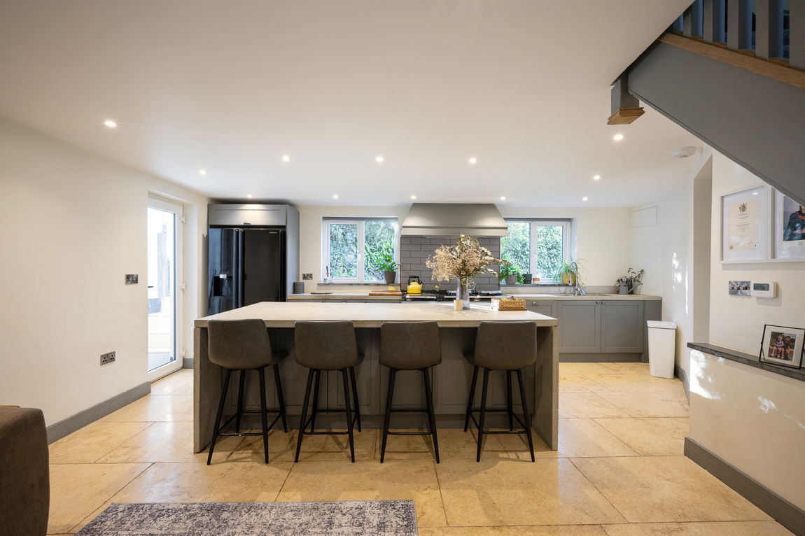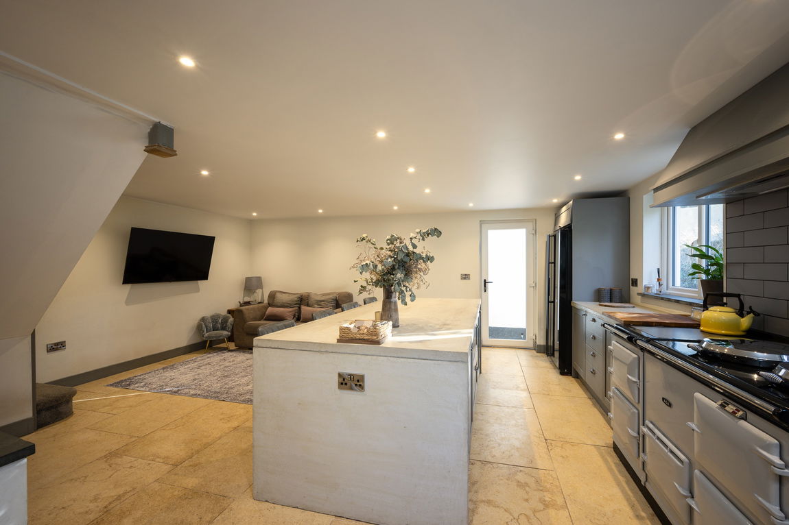 From the parking area, steps down lead to the side door into an impressive open-plan Kitchen/Diner, the true soul of the home. Designed for both everyday living and stylish entertaining, it offers a striking breakfast island, an iconic Aga, underfloor heating and generous space for family and friends to gather.